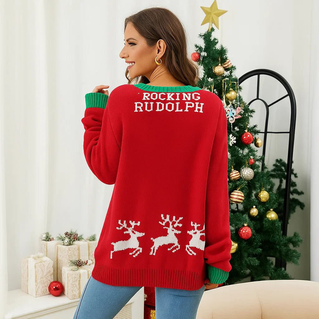 Sweter Ivyshape z kolorowym motywem renifera i napisem „GET ROCKIN’” to idealny wybór na świąteczne dni. Miękka mieszanka wełny i luźny krój zapewniają komfort i styl, sprawiając, że wyróżnisz się na każdej imprezie i spotkaniu rodzinnym.