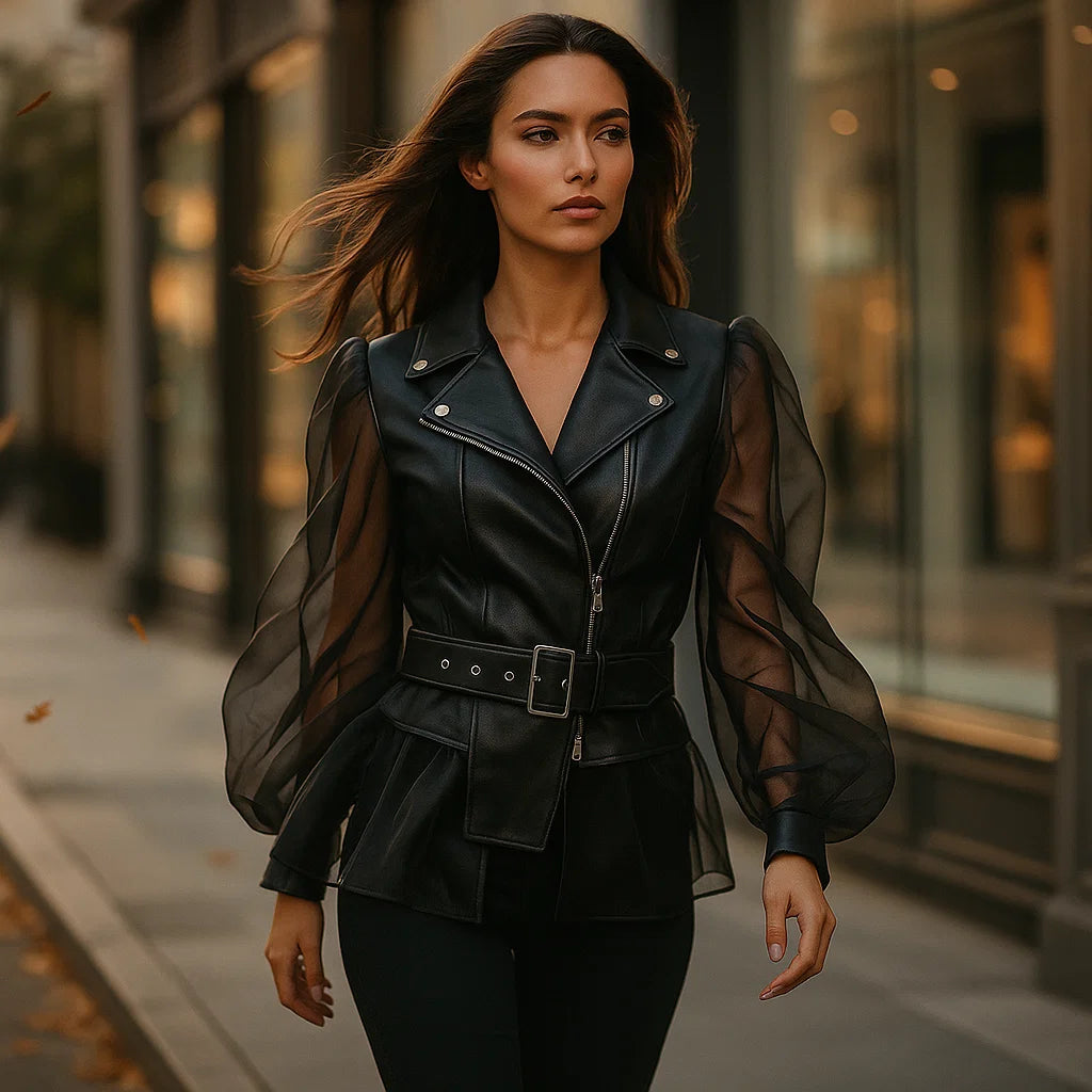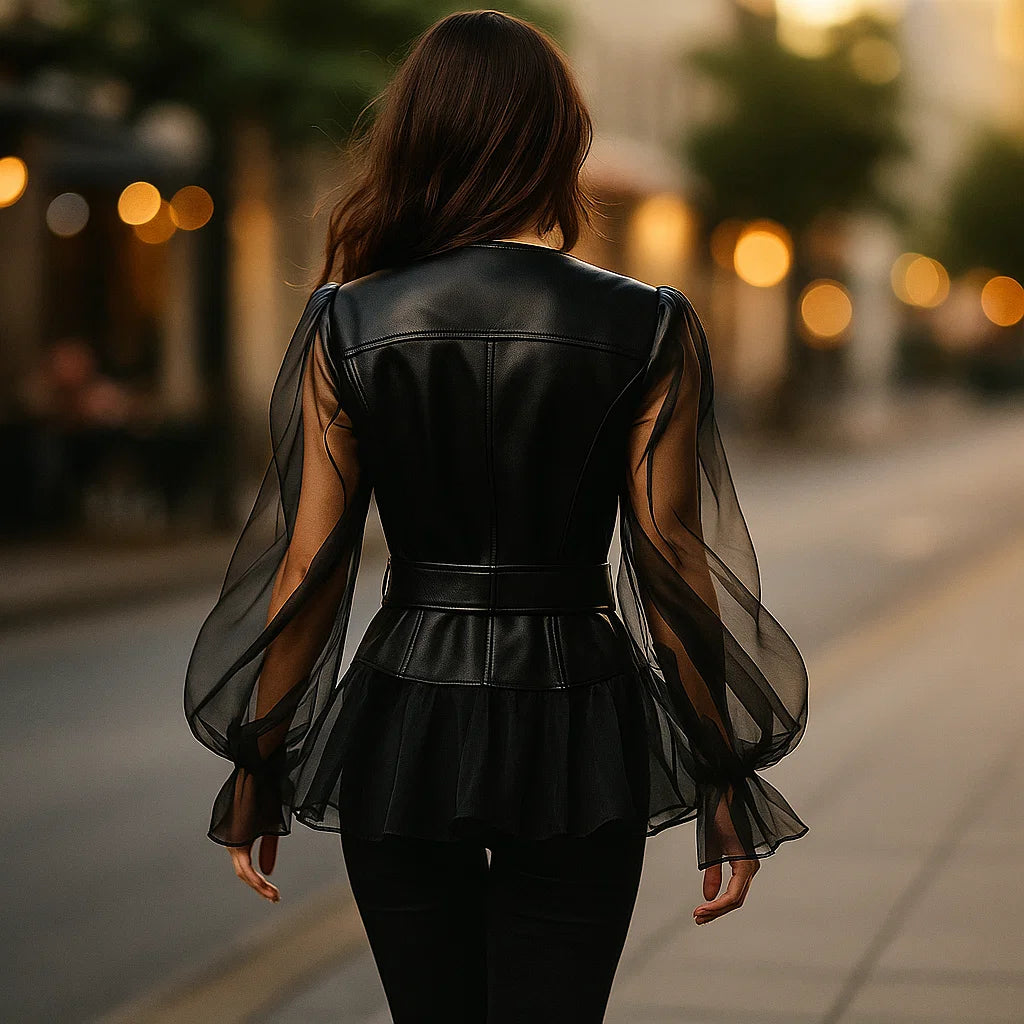 Ta wyjątkowa kurtka łączy nowoczesny design z kobiecym akcentem. Przezroczyste marszczone rękawy z organzy i pasek w talii nadają jej lekkości i charakteru – idealna na wieczorne wyjścia lub stylowy casual.